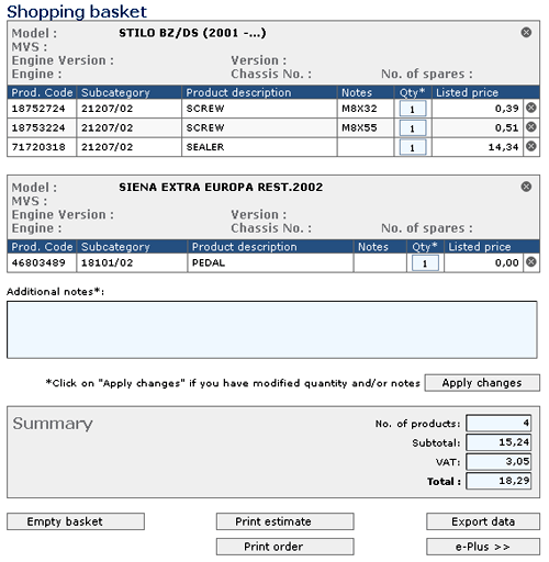 Таблица «Корзина изделий» (“Shopping basket”) содержит изделия,